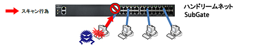 多くの不正アクセスでは、マルウェアに感染した端末を足がかりに、ネットワーク内のスキャン活動を行います。SubGateがネットワーク内のスキャン行為を自動検出、自動遮断することができるため、感染した端末からの二次拡散を防止します。
