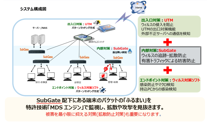 SubGateは、一般のスイッチと入れ替えるだけで、サイバー攻撃によりウイルス感染したPCからの、LAN内のウイルス感染の被害拡大や、情報漏洩を防ぎ、企業のセキュリティ脅威を最小限におさえる対策を行います。