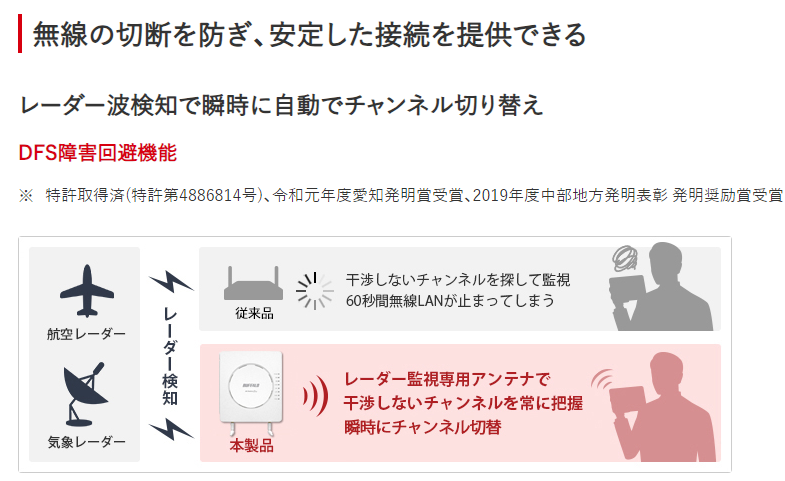 「DFS(Dynamic Frequency Selection)」による無線LAN停止を回避するため、レーダー監視専用アンテナを搭載。干渉しないチャンネルを常に監視し把握することで、レーダー波を検知した際に、瞬時に干渉しないチャンネルへと自動的にチャンネル切り替えを行います。