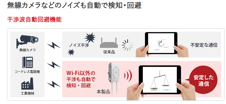 従来品では回避することができなかったコードレス電話機などWi-Fi以外の機器から出るノイズを自動で検知し、干渉しないチャンネルへ変更できます。