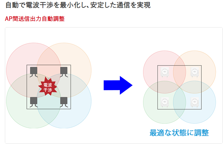 アクセスポイント間の電波干渉を防ぐ「AP間送信出力自動調整機能」「AP間チャンネル自動調整機能」を搭載。