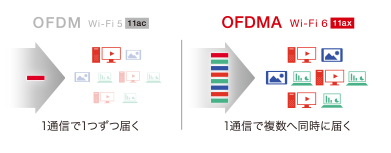 Wi-Fi 6からの新機能OFDMAでは、たくさんの台数の端末と同時に通信ができるようになり、みんなが待つことなくネットにアクセスできるようになりました。