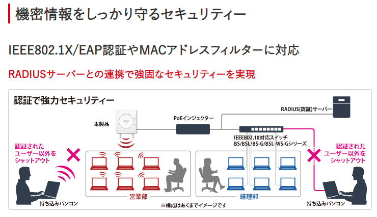 RADIUSサーバーとの組み合わせにより、アクセス許可のあるユーザーだけをネットワークに接続させるIEEE802.1X/EAP認証に対応。ユーザー情報はRADIUSサーバーで一元管理され、ユーザー管理も簡単です。さらにRADIUSサーバーに登録されたMACアドレスに基づくMACアドレス認証や無線アクセスポイント内部でのローカルDBに基づくMACアドレスフィルターにも対応しています。