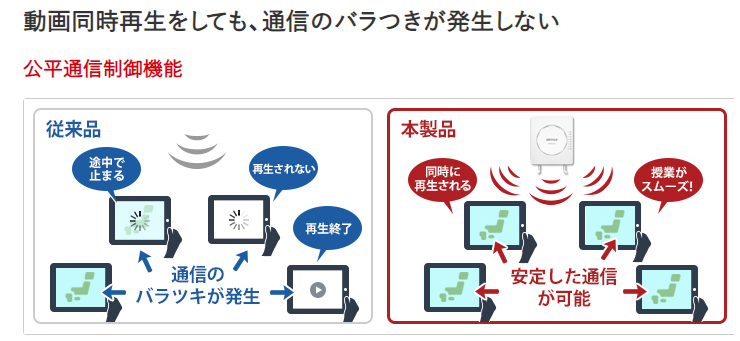 複数の端末が同時に通信してもバラツキが発生せず平等に通信を行うことができます。たとえば、多数のタブレットを利用する授業で、同時に動画再生しても、再生の遅延が生じにくく、快適な授業を行うことができます。
