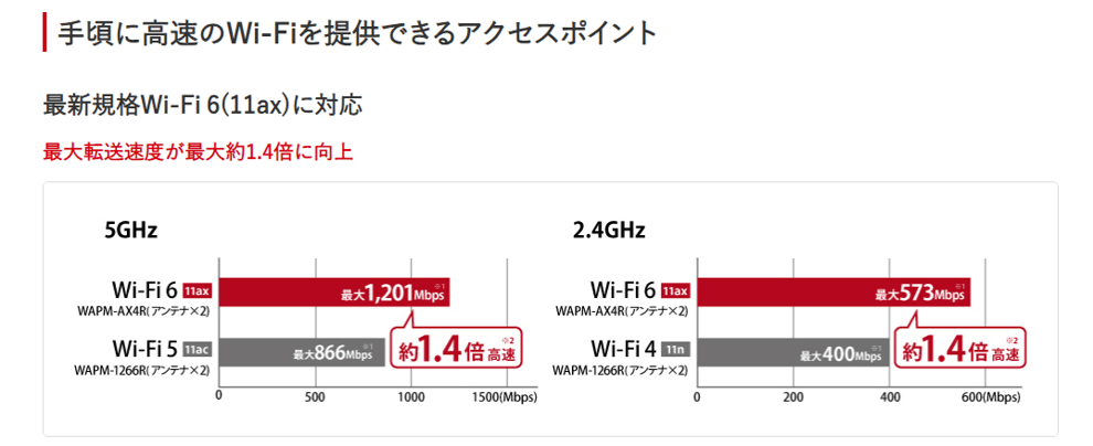 最新規格Wi-Fi 6(11ax)を採用する本商品は、Wi-Fi 5(11ac)およびWi-Fi 4(11n)を採用する従来の商品に比べ、5GHz帯と2.4GHz帯で約1.4倍の転送速度を実現しています。大容量のデータを短時間で転送でき、無線LANを介した資料のダウンロードがスムーズに行えます。Wi-Fi 5 以前の従来規格(11ac/n/a/g/b)のみに対応する端末も、従来規格の速度で接続できますので、お持ちの無線端末を買い替えずに、新しい無線LAN環境をご利用いただけます。