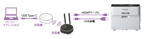 本体からUSBケーブルによる給電が可能なので、RICOH Wireless Projectionや、リコーデジタルサイネージのSTB(セットトップボックス)を接続してお使いいただく際、配線・設置が簡単に行えます。