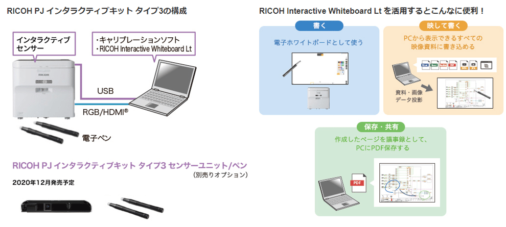 RICOH PJ インタラクティブキット タイプ3(別売りオプション)を装着すると、本格的な電子ホワイトボードとしてお使いいただけます。電子ペンは反応が良く、筆記の位置ずれも少ない、スムーズな書き心地を実現しました。加えて、4本同時の書込みが可能です。また、付属ソフトのRICOH Interactive Whiteboard Lt for Windows®には、ホワイトボード機能に加え、投影した映像や資料の上に書き込める機能と、それらをPDFで保存する機能を備えており、打合せや会議はもちろん、授業や研修などでも、様々なシーンでお役に立てます。