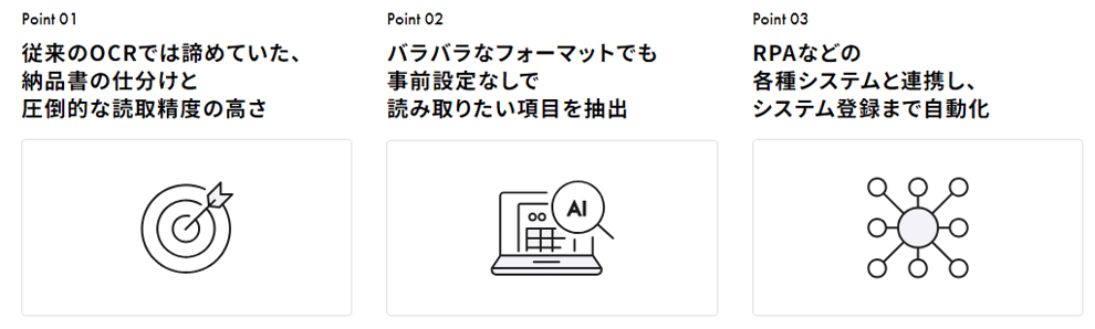 どのような帳票でも、定型・非定型のフォーマットを問わずAI-OCRが読み取り、欲しいテキストを自動で抽出します。アウトプットは、CSVやJSONやサーチャブルPDFなど様々な形式で出力することが可能です。