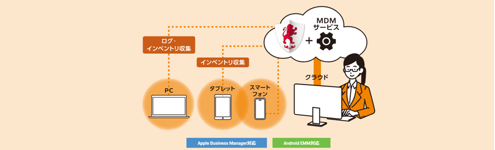 MDMサービス「BizMobile Go!」と連携し、Windows PCやMacに加えて、スマートフォンやタブレットのインベントリ情報を収集します。収集した情報を基に、各IT資産管理台帳で一元管理できます。