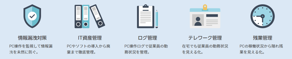 社内PCの総合的な運用管理に必要とされる機能を一式標準搭載しています。特に各種操作制限機能を中心に高いアドバンテージを持つクラウドサービスです。
