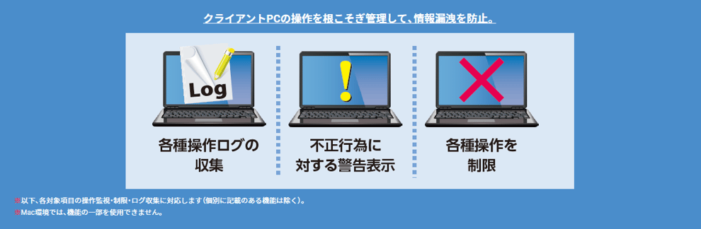 組織の2大クライアント端末であるWindowsとMacのPC操作監視およびIT資産管理に対応しています。各種操作ログの収集、操作制限、インベントリ収集、ライセンス管理などが可能です。