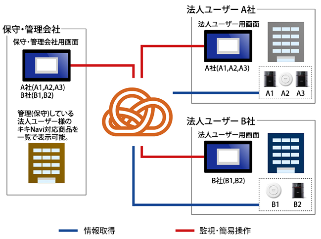・保守・管理会社は、法人ユーザーA社とB社の機器を「監視、簡易操作」