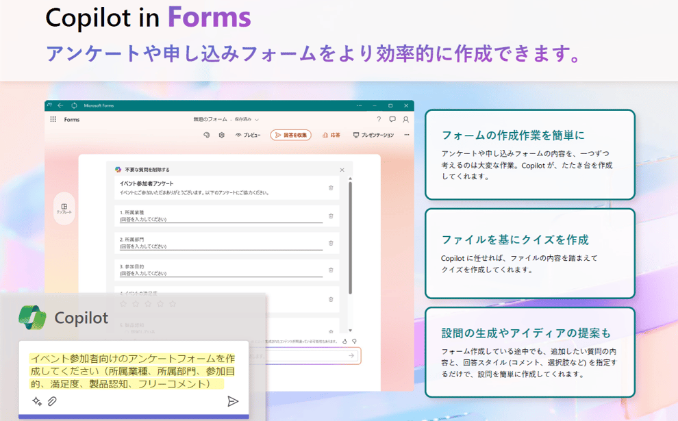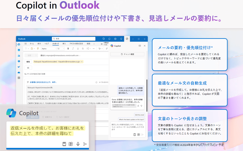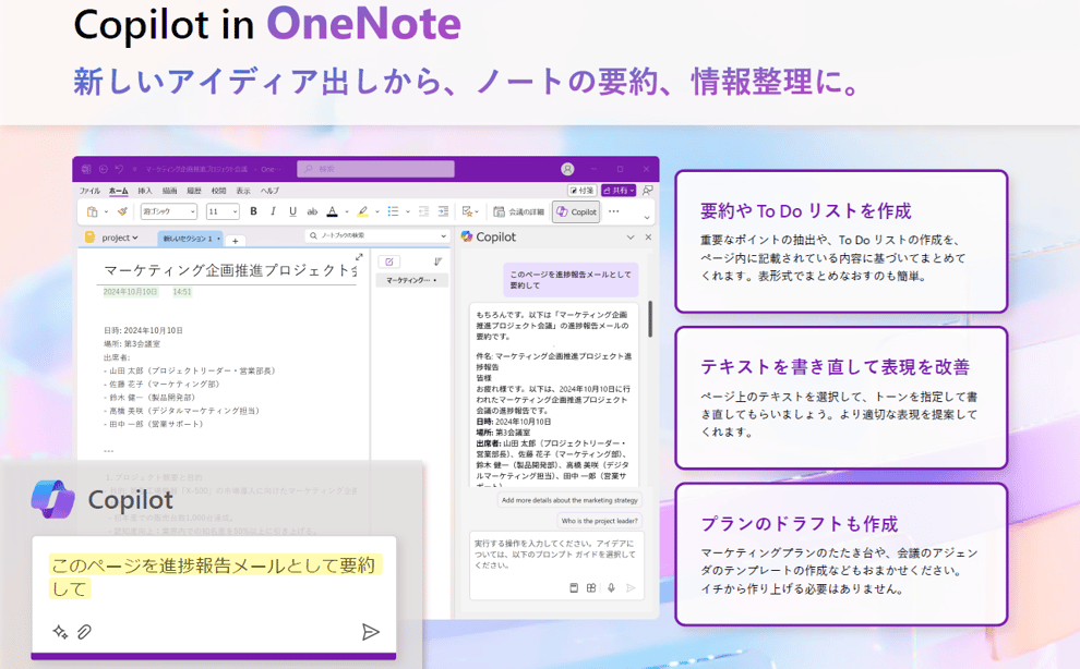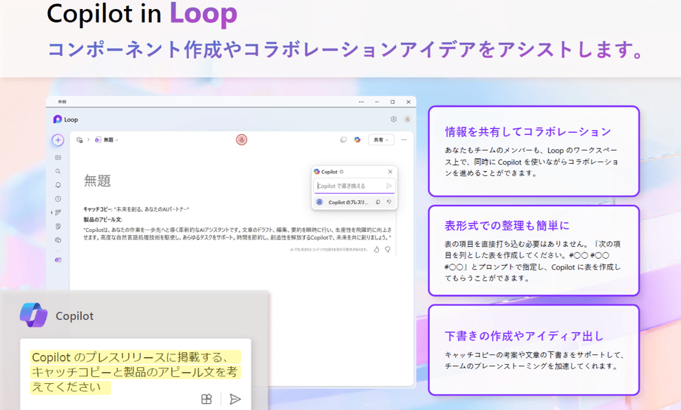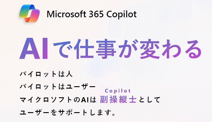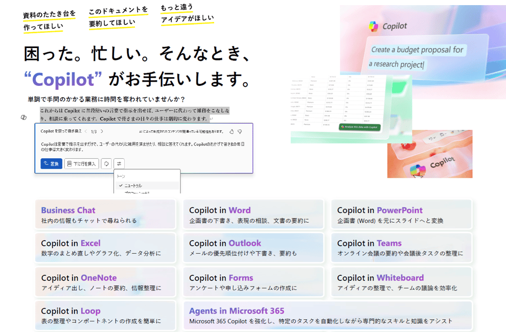 Microsoft 365 Copilot は、生成AI の力を活かして、ユーザーの多様な要求に応えるAI アシスタントです。Word、Excel、PowerPoint、Outlook、Teams といった日常的な業務で利用するMicrosoft 365 アプリに組み込まれ、副操縦士ーCopilot として、パイロットであるユーザーの仕事をサポートします。例えば、Copilot in Word に「来月、開催するイベントの企画書を書いて」と指示することで素案が書き起こされ、そうして仕上げた企画書からPowerPoint の発表資料が作成できるようになります。オンライン会議の議事録作成、Excel シートのグラフ作成、お客様への返信メールの下書き作成など、様々なビジネスの場面でユーザーの雑務を引き受けたり、相談に乗ってくれます。
