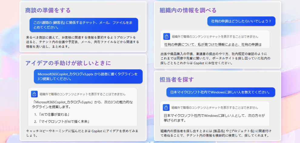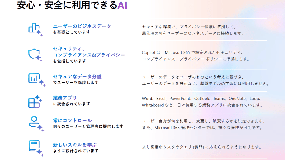 Microsoft 365 Copilot は、LLM : Large Language Model (大規模言語モデル)とMicrosoft Graph を組み合わせた生成AI をMicrosoft 365 アプリに組み込み、データソースとしてWeb 上の情報も利用しながら、自然言語によるユーザーの指示(プロンプト)に応えていきます。プロンプトの内容やMicrosoft Graph からアクセスできるデータ、顧客データはMicrosoft 365 Copilot が使用する基礎モデルの学習には使用されません。さらにMicrosoft 365 Copilot では、テナントやグループ、個々のデータを保護するように設計されています。