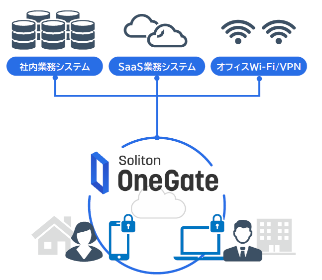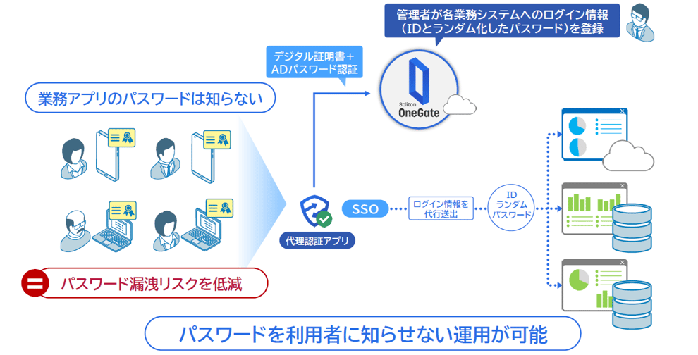 企業の大切な情報を管理する業務システムを、IDとパスワードだけで利用していたら、第三者にとって、乗っ取りは簡単です。また、会社が許可していない端末が繋がってしまう環境では、情報漏えいリスクは大きく高まります。OneGateは、パスワードの脆弱性を解決するデジタル証明書で、利用者と利用端末を特定し、企業の情報を不正アクセスから守ります。